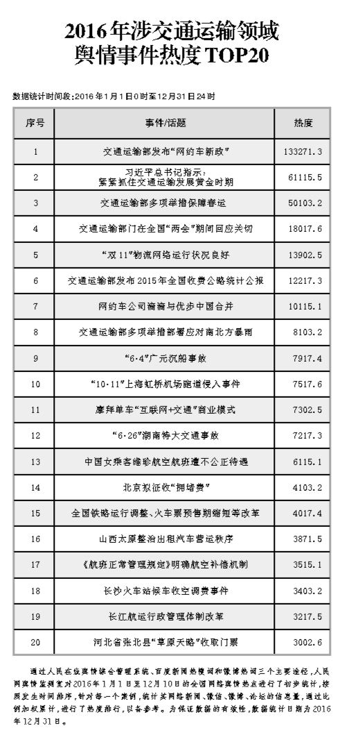 人民網(wǎng)輿情監(jiān)測(cè)室的統(tǒng)計(jì)數(shù)據(jù)顯示,“網(wǎng)約車(chē)新政”“交通運(yùn)輸‘十三五’規(guī)劃”“交通運(yùn)輸發(fā)展黃金時(shí)期”“互聯(lián)網(wǎng)+交通運(yùn)輸”“春運(yùn)火車(chē)票”“四縱四橫”“收費(fèi)公路”“京津冀交通一體化”“長(zhǎng)江航運(yùn)”“交通運(yùn)輸+扶貧”為2016年交通運(yùn)輸行業(yè)熱詞TOP10。