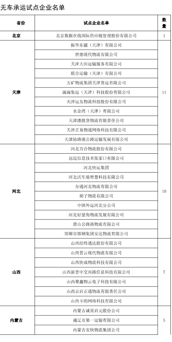 3月6日,交通運(yùn)輸部發(fā)布《交通運(yùn)輸部辦公廳關(guān)于做好無(wú)車(chē)承運(yùn)試點(diǎn)運(yùn)行監(jiān)測(cè)工作的通知》?!锻ㄖ凤@示,截至目前,29個(gè)?。▍^(qū)、市)共篩選確定了283個(gè)無(wú)車(chē)承運(yùn)試點(diǎn)企業(yè)并報(bào)部。
