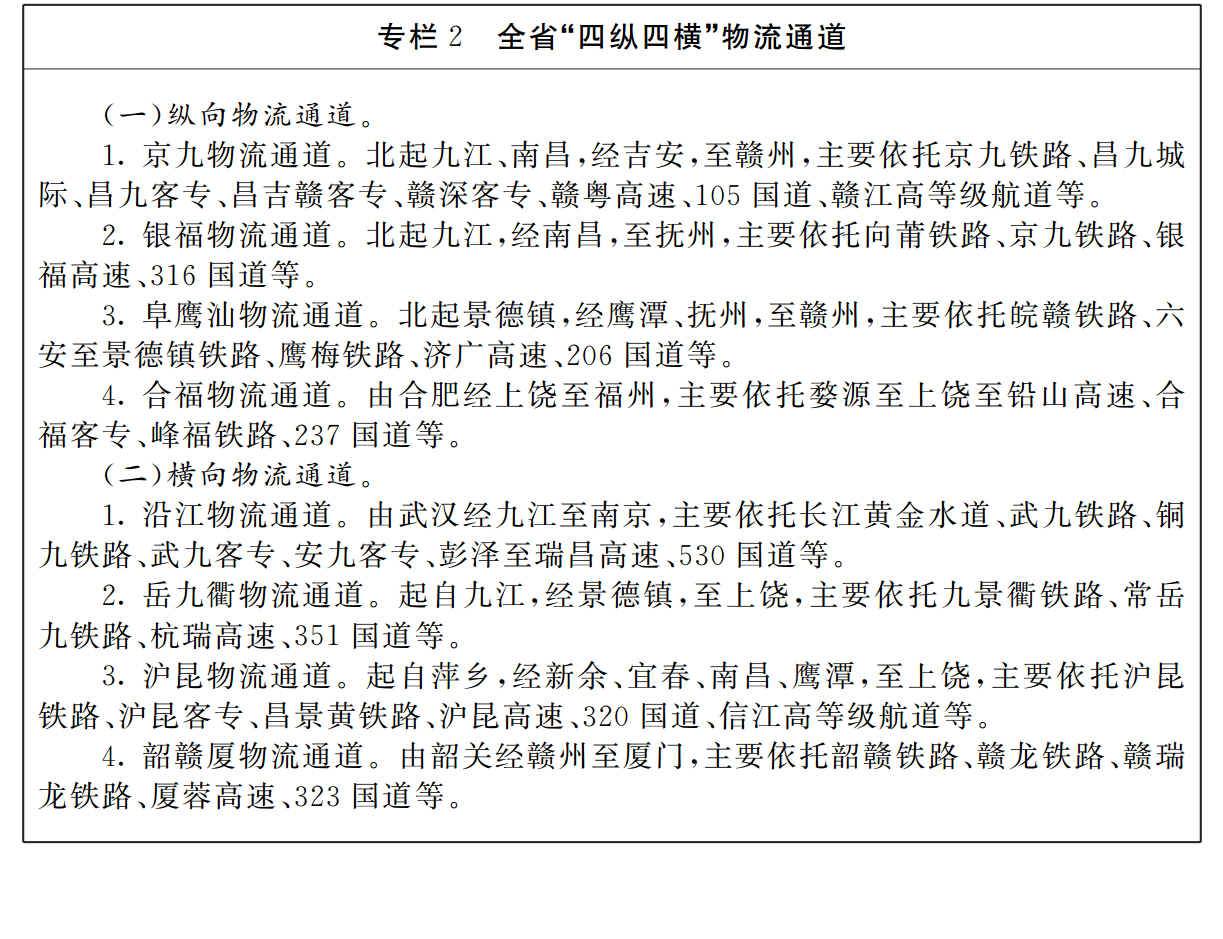充分發(fā)揮我省交通區(qū)位優(yōu)勢,著力構建以長久物流樞紐為核心,以贛中南、贛東北、贛東南、贛西四大特色物流集聚發(fā)展區(qū)為支撐,以“四縱四橫”物流通道為紐帶的“一核四區(qū)多通道”發(fā)展格局,并積極拓展國際物流發(fā)展空間。