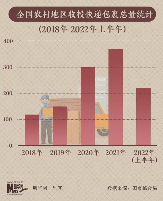 從上圖可以看出,2018年-2021年,全國農(nóng)村地區(qū)快遞包裹收投總量在逐年上升,由2018年的120億件上升到2021年的370億件。龐大的快遞包裹數(shù)據(jù)背后,是加速推進(jìn)的“快遞進(jìn)村”步伐和不斷增強的農(nóng)村經(jīng)濟(jì)活力,也讓人看到了農(nóng)村消費市場蘊藏的巨大潛力。