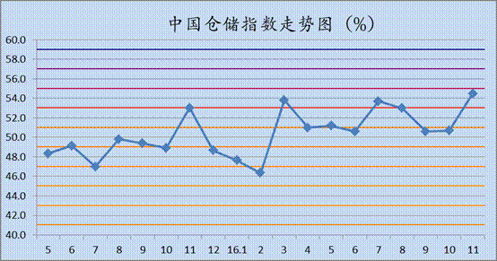 中國物流與采購聯(lián)合會與中儲發(fā)展股份有限公司聯(lián)合調(diào)查的2016年11月中國倉儲指數(shù)為54.5%,較上月回升3.8個百分點,連續(xù)九個月位于擴張區(qū)間,并創(chuàng)2015年3月份以來的新高。各分項指數(shù)中,業(yè)務(wù)利潤指數(shù)及企業(yè)員工指數(shù)較上月有所下降,其余指數(shù)均有不同程度的回升。