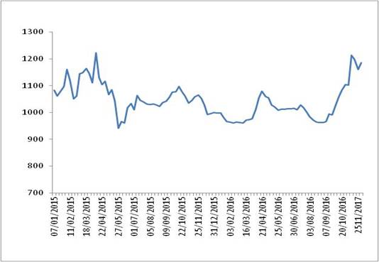 圖 1 2015-2016年各周中國公路物流運價指數(shù)