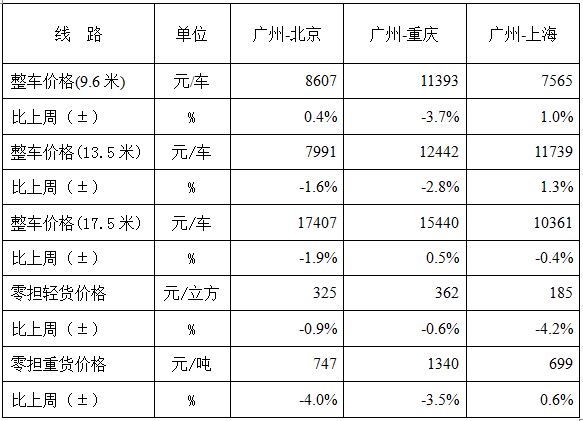 表1 本周部分線路平均價格及環(huán)比情況對比