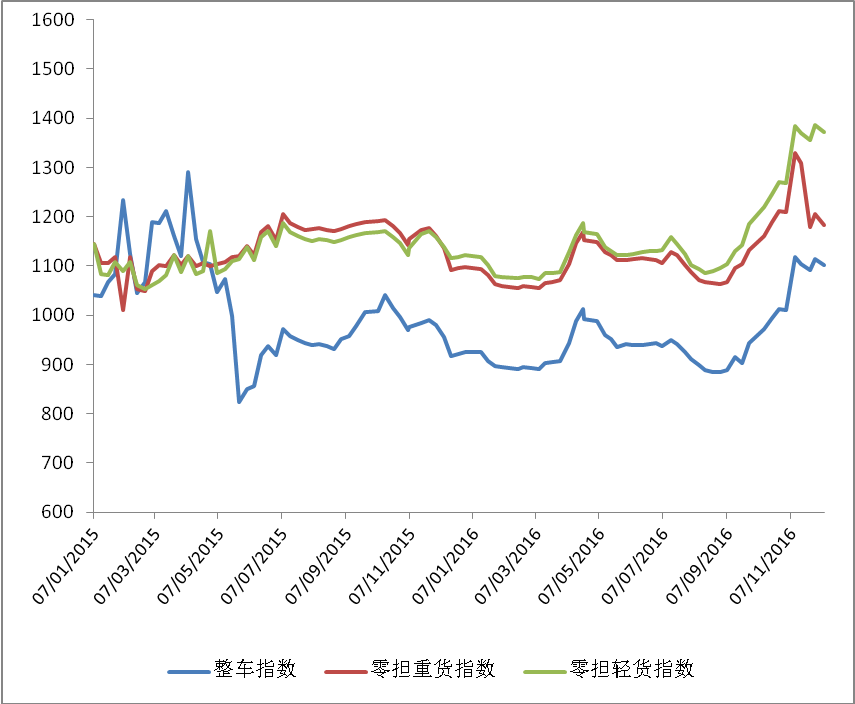 各車型指數(shù)環(huán)比均有不同程度回落,但各車型均高于上年同期水平。其中,整車指數(shù)為1101.7點,環(huán)比回落1.1%,但比上年同期增長15.3%;零擔輕貨指數(shù)為1371.8點,環(huán)比回落1.1%;零擔重貨指數(shù)為1182.6點,環(huán)比回落1.9%。