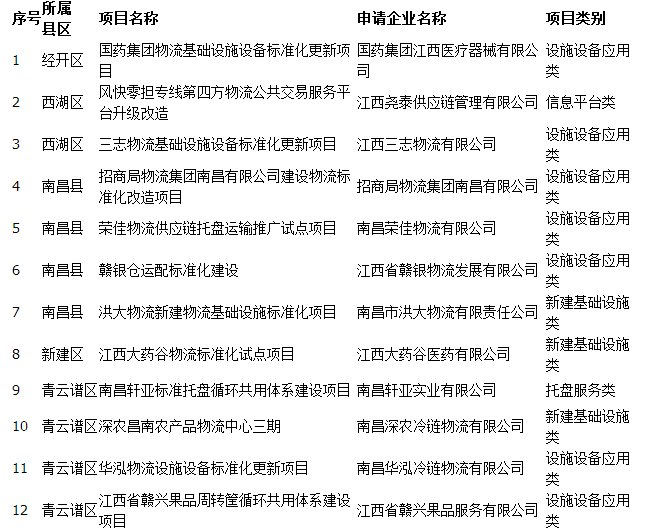 根據(jù)南昌市商務(wù)局、市財(cái)政局、市市場和質(zhì)量監(jiān)督管理局《關(guān)于開展第二批南昌市物流標(biāo)準(zhǔn)化試點(diǎn)項(xiàng)目申報(bào)工作的通知》(洪商務(wù)發(fā)[2017]36號(hào))有關(guān)精神,南昌市第二批物流標(biāo)準(zhǔn)化試點(diǎn)項(xiàng)目申報(bào)工作經(jīng)公開征集、自愿申報(bào)、縣區(qū)初審把關(guān)并推薦,由第三方中介華東交通大學(xué)交通運(yùn)輸與物流學(xué)院組織專家評審、現(xiàn)場勘驗(yàn)、現(xiàn)場答辯,現(xiàn)華東交通大學(xué)交通運(yùn)輸與物流學(xué)院報(bào)來擬入圍南昌市第二批物流標(biāo)準(zhǔn)化試點(diǎn)企業(yè)及項(xiàng)目等,并征求市財(cái)政局、市市場監(jiān)管局意見后,經(jīng)2017年4月19日市商務(wù)局黨委研究同意后,現(xiàn)予以公示?,F(xiàn)將擬入圍南昌市第二批物流標(biāo)準(zhǔn)化試點(diǎn)企業(yè)及項(xiàng)目公示如下: